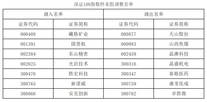深证100指数样本股调入藏格矿业、国货航、东山精密、光启技术、胜宏科技、新诺威、安克创新;调出天山股份、山西焦煤、晶澳科技、晶盛机电、泰格医药、康龙化成、卓胜微等7只个股。