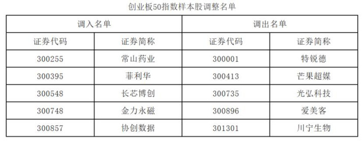 创业板50指数样本股调入常山药业、菲利华、长芯博创、金力永磁、协创数据;调出特锐德、芒果超媒、光弘科技、爱美客、川宁生物。