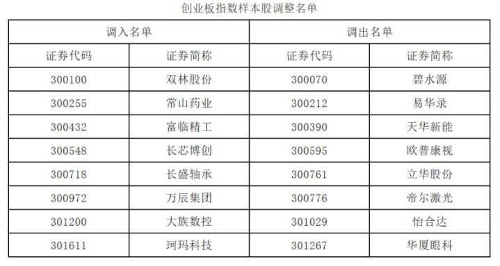 创业板指样本股调入双林股份、常山药业、富临精工、长芯博创、长盛轴承、万辰集团、大族数控、珂玛科技;调出碧水源、易华录、天华新能、欧普康视、立华股份、帝尔激光、怡合达、华厦眼科。